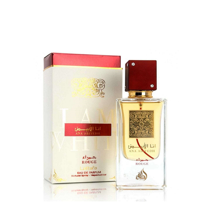 Ana Abiyedh Rouge od Lattafa Perfumes je drveni začinski miris za žene i muškarce. Ana Abiyedh Rouge je predstavljen 2016. Gornje note su Nashi kruška, Kumquat i Bergamot; srednje note su Karamela i Geranijum; bazne note su Ambergris, Mošus i Mahovina.