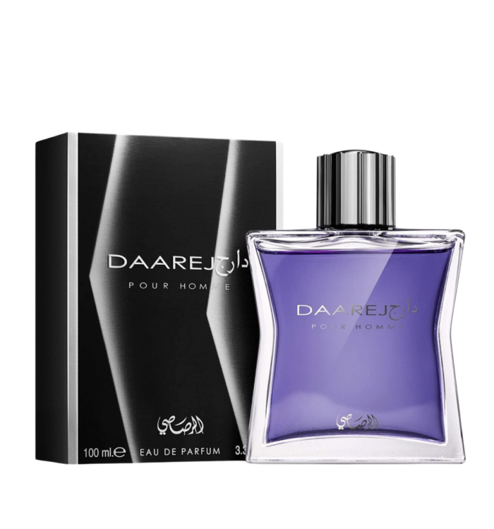 Daarej pour Homme od Rasasi je amber začinski miris za muškarce. Gornje note su Kumin, Kardamon i Artemizija; srednje note su Ruža i Koren irisa; bazne note su Vanilija, Mahune Tonke, Amber, Sandalovo drvo, pačuli i mošus.
