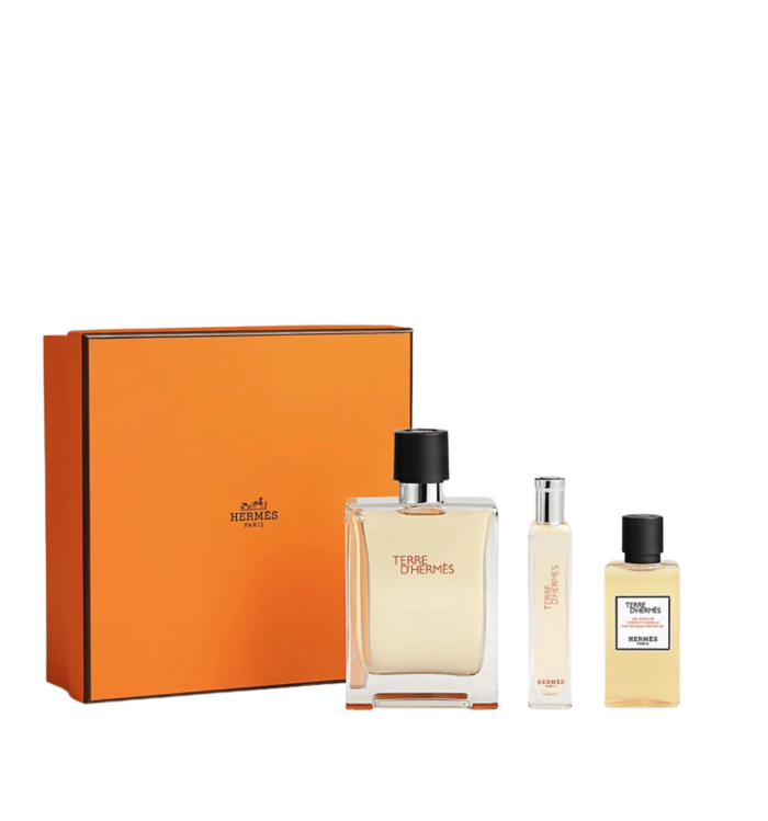 Ovaj poklon set sadrži: jednu 100 ml bočicu Terre d’Hermès eau de toilette, jednu 15 ml bočicu Terre d’Hermès eau de toilette u putnom pakovanju, i jedan 40 ml gel za tuširanje za kosu i telo.